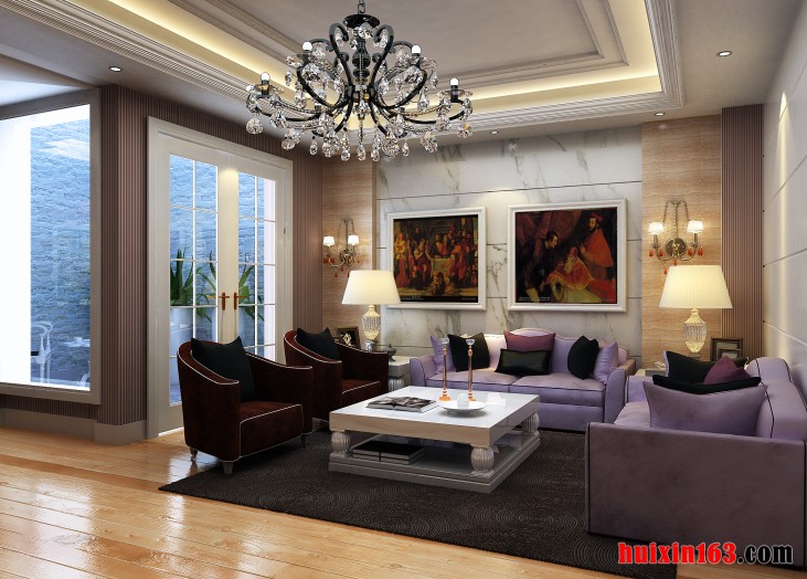 本套为混搭风格装修,客厅欧式与美式的设计同时融入其中,奢华感从中流露,款式新颖的水晶灯在其中最为显眼,紫色的沙发,搭配红色的座椅、时尚的家具、给人完美的视觉盛宴,打造出了经典居家空间。空间利用配饰、家纺等来搭配。充分利用空间形式与材料,创造出个性化的家居环境。实现个性化装修的手段,展现出了家居的百变风情。透露着一股奢华的气息,给整个空间带来了一丝丝清新之意。