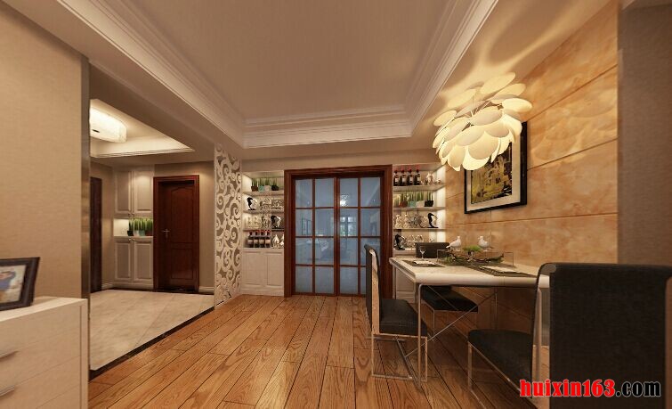 在本案例的设计当中,所展现的是一种浪漫温馨的氛围,其中又蕴含着现代简约的时尚感,在客厅的装饰布置当中,采用平顶式的石膏板吊顶,背景色彩以白色为主,搭配上一盏亮丽的水晶吊灯,让空间显得比较明亮透彻,米白色的沙发背景墙与纯白色布艺的沙发添加,其色彩与整个空间的色彩相互协调统一,沙发背景墙后三幅壁画的悬挂,也营造出一种艺术的氛围,反观电视背景墙的设计,通过大理石作为电视背景墙的背景,实木铺设的地砖,浅黄色的色彩更是展现出一种低调的奢华美观,并且餐厅的布置也有着很大的设计看点,不管是造型还是色彩搭配,其中吊灯的安装更是凝聚着空间的视觉焦点。