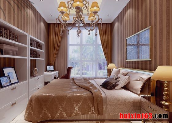 卧室的装饰采用的装修手法不同带来的装饰效果也会有很大的差异,主卧的装修奢华大气又不失温馨浪漫感,白色的石膏板吊顶提升空间,条纹的墙面壁纸的铺设让卧室的立体造型更加的突出,白色的整体搁置架的存在既可以起到装饰作用,还可以进行装饰品的摆放。