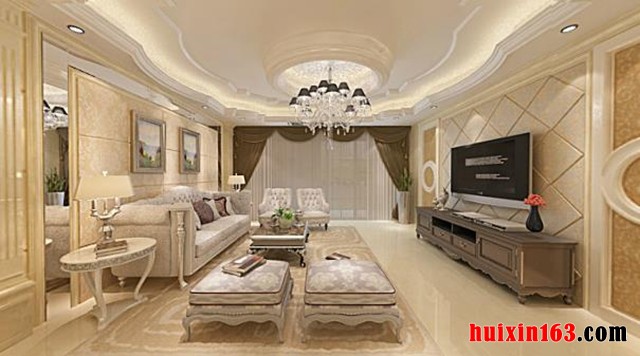 曲边客厅吊顶设计,增加了温婉柔美的感觉。华美的水晶大吊灯悬挂在客厅吊顶中央,映得家居熠熠生辉。菱形格子硬包电视背景墙设计,清晰的纹理让背景墙显得是十分立体。两侧石膏装饰工艺塑性,金色花纹墙纸装饰,整个背景墙看上去华贵大气。在以浅色为基色的家居中,适当深色点缀可平衡家居色彩,造型优美的咖啡色电视柜,在客厅中显得格外醒目,流畅柔美的底边,局部镶花设计,体现出了欧式家具的优雅与端庄。灰色软包欧式沙发,体态端庄,尽显高贵典雅。花纹墙砖结合银镜打造的电视背景墙,为室内增添了些许时尚的现代元素,让背景墙看上去高雅且时尚,简约大方。